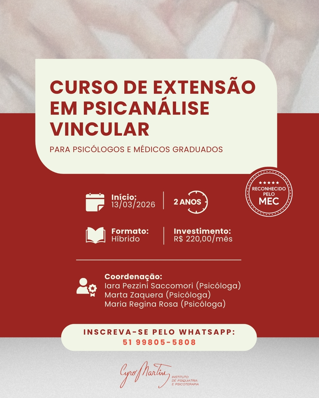 Estão abertas as inscrições para o Curso de Extensão em Psicanálise Vincular, voltado a psicólogos, médicos e profissionais da área psi interessados em aprofundar a compreensão clínica das configurações vinculares contemporâneas.